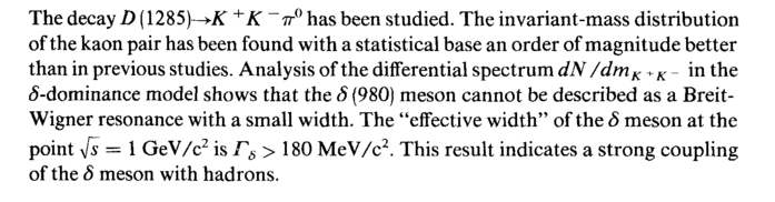 The decay D (1285)—+K ™7г° has been studied. The invariant-mass distribution of the kaon pair has been found with a statistical base an order of magnitude better than in previous studies. Analysis of the differential spectrum dN/dmK +Kin the ^-dominance model shows that the δ (980) meson cannot be described as a Breit-Wigner resonance with a small width. The "effective width" of the δ meson at the point yfs = 1 GeV/c2 is Γδ > 180 MeV/c2. This result indicates a strong coupling of the δ meson with hadrons.
