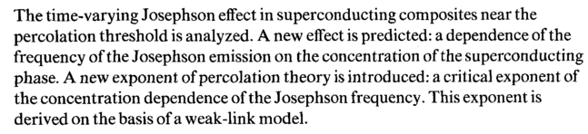 The time-varying Josephson eifect in superconducting composites near the percolation threshold is analyzed. A new eifect is predicted: a dependence of the frequency of the Josephson emission on the concentration of the superconducting phase. A new exponent of percolation theory is introduced; a critical exponent of the concentration dependence of the Josephson frequency. This exponent is derived on the basis of a weak-link model.