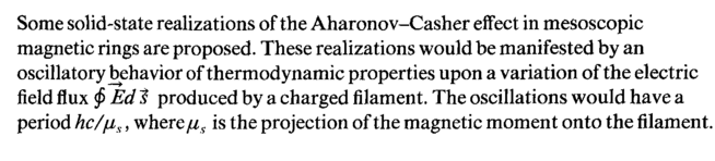 Some solid-state realizations of the Aharonov-Casher effect in mesoscopic magnetic rings are proposed. These realizations would be manifested by an oscillatory behavior of thermodynamic properties upon a variation of the electric field flux §Edi produced by a charged filament. The oscillations would have a period hc/μ,, where μs is the projection of the magnetic moment onto the filament.