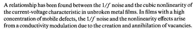 A relationship has been found between the \/f noise and the cubic nonlinearity of the current-voltage characteristic in unbroken metal films. In films with a high concentration of mobile defects, the \/f noise and the nonlinearity effects arise from a conductivity modulation due to the creation and annihilation of vacancies.