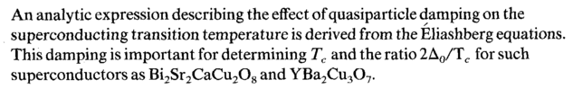 An analytic expression describing the effect of quasiparticle damping on the superconducting transition temperature is derived from the Eliashberg equations. This damping is important for determining Tc and the ratio 2Д0/ТС for such superconductors as Bi2Sr2CaCu208 and YBa2Cu307.