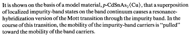 It is shown on the basis of a model material, p-CdSn As2 (Cu), that a superposition of localized impurity-band states on the band continuum causes a resonance-hybridization version of the Mott transition through the impurity band. In the course of this transition, the mobility of the impurity-band carriers is "pulled" toward the mobility of the band carriers.