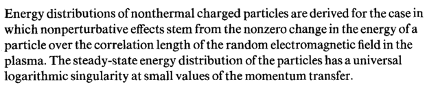 Energy distributions of nonthermal charged particles are derived for the case in which nonperturbative effects stem from the nonzero change in the energy of a particle over the correlation length of the random electromagnetic field in the plasma. The steady-state energy distribution of the particles has a universal logarithmic singularity at small values of the momentum transfer.