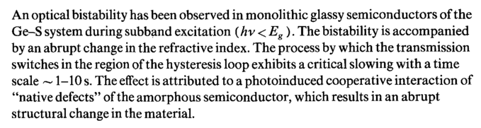 An optical bistability has been observed in monolithic glassy semiconductors of the Ge-S system during subband excitation (hv<Eg). The bistability is accompanied by an abrupt change in the refractive index. The process by which the transmission switches in the region of the hysteresis loop exhibits a critical slowing with a time scale ~ 1-10 s. The effect is attributed to a photoinduced cooperative interaction of "native defects" of the amorphous semiconductor, which results in an abrupt structural change in the material.