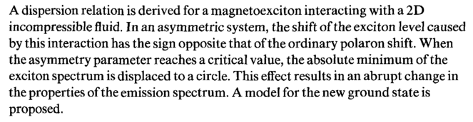 A dispersion relation is derived for a magnetoexciton interacting with a 2D incompressible fluid. In an asymmetric system, the shift of the exciton level caused by this interaction has the sign opposite that of the ordinary polaron shift. When the asymmetry parameter reaches a critical value, the absolute minimum of the exciton spectrum is displaced to a circle. This effect results in an abrupt change in the properties of the emission spectrum. A model for the new ground state is proposed.
