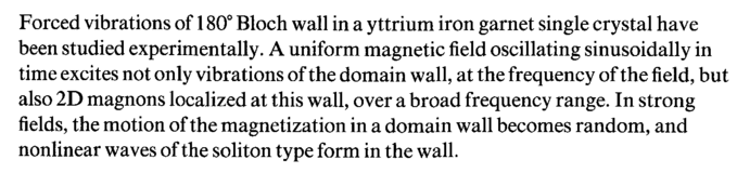 Forced vibrations of 180° Bloch wall in a yttrium iron garnet single crystal have been studied experimentally. A uniform magnetic field oscillating sinusoidally in time excites not only vibrations of the domain wall, at the frequency of the field, but also 2D magnons localized at this wall, over a broad frequency range. In strong fields, the motion of the magnetization in a domain wall becomes random, and nonlinear waves of the soliton type form in the wall.