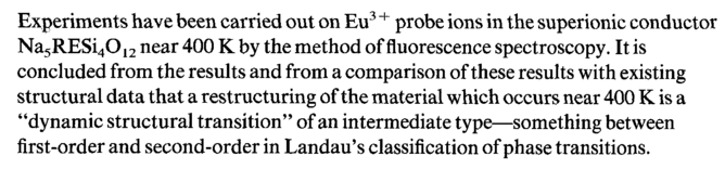 Experiments have been carried out on Eu3 + probe ions in the superionic conductor Na5RESi4012 near 400 К by the method of fluorescence spectroscopy. It is concluded from the results and from a comparison of these results with existing structural data that a restructuring of the material which occurs near 400 К is a "dynamic structural transition" of an intermediate type—something between first-order and second-order in Landau's classification of phase transitions.