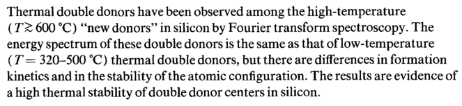 Thermal double donors have been observed among the high-temperature (T% 600 °C) "new donors" in silicon by Fourier transform spectroscopy. The energy spectrum of these double donors is the same as that of low-temperature (T= 320-500 °C) thermal double donors, but there are differences in formation kinetics and in the stability of the atomic configuration. The results are evidence of a high thermal stability of double donor centers in silicon.