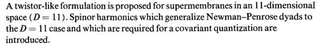 A twistor-like formulation is proposed for supermembranes in an 11-dimensional space (D = 11). Spinor harmonics which generalize Newman-Penrose dyads to the D = 11 case and which are required for a covariant quantization are introduced.