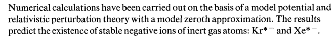 Numerical calculations have been carried out on the basis of a model potential and relativistic perturbation theory with a model zeroth approximation. The results predict the existence of stable negative ions of inert gas atoms: Кг* ~ and Xe* ~~.