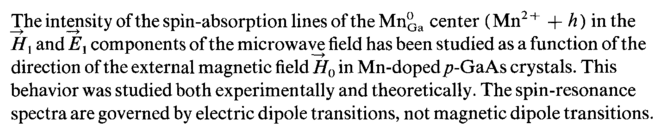The intensity of the spin-absorption lines of the Мпоа center (Μη2 + + h) in the Hx and EA components of the microwave field has been studied as a function of the direction of the external magnetic field H0 in Mn-doped/7-GaAs crystals. This behavior was studied both experimentally and theoretically. The spin-resonance spectra are governed by electric dipole transitions, not magnetic dipole transitions