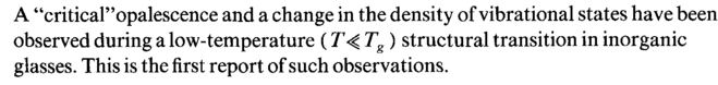 A "criticaP'opalescence and a change in the density of vibrational states have been observed during a low-temperature (Г< Tg ) structural transition in inorganic glasses. This is the first report of such observations.