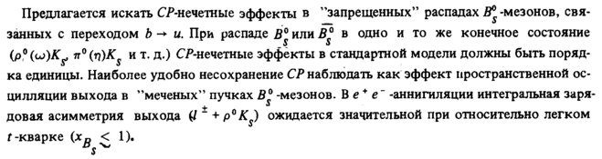 Предлагается искать СР-нечетные эффекты в "запрещенных" распадах В0 -мезонов, свя... 5 занных с переходом b -> и. При распаде В0 или В° в одно и то же конечное состояние S S (р,° (ω)ΛΓ^ я0 in)K и т. д.) CP-нечетные эффекты в стандартной модели должны быть порядка единицы. Наиболее удобно несохранение CP наблюдать как эффект пространственной осцилляции выхода в "меченых" пучках В* -мезонов. В е* е~ -аннигиляции интегральная заря-довая асимметрия выхода (/ + P°KS) ожидается значительной при относительно легком t -кварке (xR < 1).