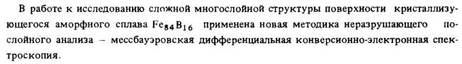 В работе к исследованию сложной многослойной структуры поверхности кристаллизующегося аморфного сплава Fe84B16 применена новая методика неразрушающего послойного анализа — мессбауэровская дифференциальная конверсионно-электронная спектроскопия.