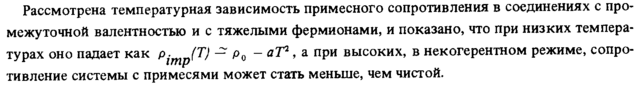 Рассмотрена температурная зависимость примесного сопротивления в соединениях с промежуточной валентностью и с тяжелыми фермионами, и показано, что при низких температурах оно падает как Pjm„(T) — Ρ о ~ αΊ^ > а ПРИ высоких, в некогерентном режиме, сопротивление системы с примесями может стать меньше, чем чистой.
