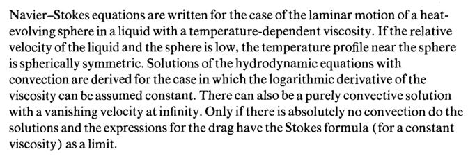 Navier-Stokes equations are written for the case of the laminar motion of a heat-evolving sphere in a liquid with a temperature-dependent viscosity. If the relative velocity of the liquid and the sphere is low, the temperature profile near the sphere is spherically symmetric. Solutions of the hydrodynamic equations with convection are derived for the case in which the logarithmic derivative of the viscosity can be assumed constant. There can also be a purely convective solution with a vanishing velocity at infinity. Only if there is absolutely no convection do the solutions and the expressions for the drag have the Stokes formula (for a constant viscosity) as a limit.