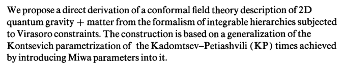 We propose a direct derivation of a conformal field theory description of 2D quantum gravity + matter from the formalism of integrable hierarchies subjected to Virasoro constraints. The construction is based on a generalization of the Kontsevich parametrization of the Kadomtsev-Petiashvili (KP) times achieved by introducing Miwa parameters into it.
