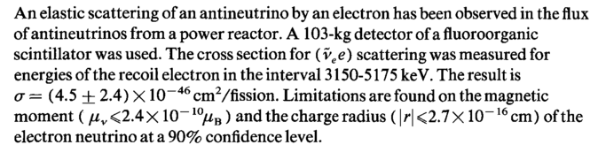 An elastic scattering of an antineutrino by an electron has been observed in the flux of antineutrinos from a power reactor. A 103-kg detector of a fluoroorganic scintillator was used. The cross section for (ve e) scattering was measured for energies of the recoil electron in the interval 3150-5175 keV. The result is σ — (4.5 + 2.4) Χ 10-46 cmVfission. Limitations are found on the magnetic moment ( μν<2.4χ 10~10μΒ) and the charge radius (|r|<2.7X 10"16 cm) of the electron neutrino at a 90% confidence level.