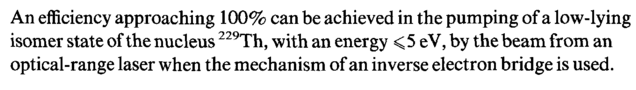 An efficiency approaching 100% can be achieved in the pumping of a low-lying isomer state of the nucleus 229Th, with an energy < 5 eV, by the beam from an optical-range laser when the mechanism of an inverse electron bridge is used.
