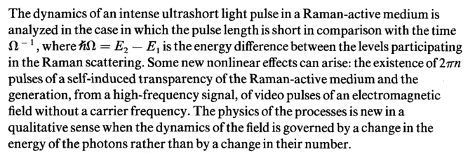 The dynamics of an intense ultrashort light pulse in a Raman-active medium is analyzed in the case in which the pulse length is short in comparison with the time ii ~1, where fiil = E2 — Ex is the energy difference between the levels participating in the Raman scattering. Some new nonlinear effects can arise: the existence οϊίπη pulses of a self-induced transparency of the Raman-active medium and the generation, from a high-frequency signal, of video pulses of an electromagnetic field without a carrier frequency. The physics of the processes is new in a qualitative sense when the dynamics of the field is governed by a change in the energy of the photons rather than by a change in their number.