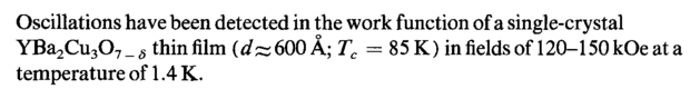 Oscillations have been detected in the work function of a single-crystal YBa2Cu307_(5 thinfilm (rf~600 A; Tc = 85 K) in fields of 120-150 kOe at a temperature of 1.4 K.