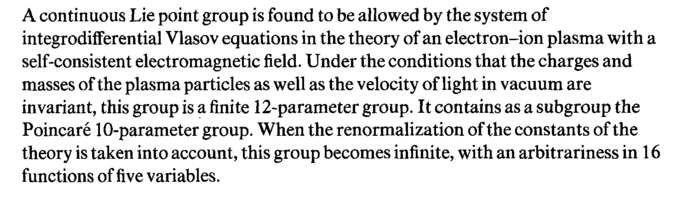 A continuous Lie point group is found to be allowed by the system of integrodifferential Vlasov equations in the theory of an electron-ion plasma with a self-consistent electromagnetic field. Under the conditions that the charges and masses of the plasma particles as well as the velocity of light in vacuum are invariant, this group is a finite 12-parameter group. It contains as a subgroup the Poincare 10-parameter group. When the renormalization of the constants of the theory is taken into account, this group becomes infinite, with an arbitrariness in 16 functions of five variables.