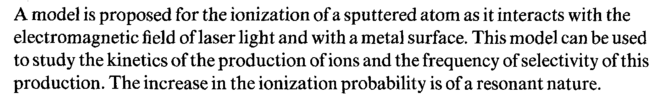 A model is proposed for the ionization of a sputtered atom as it interacts with the electromagnetic field of laser light and with a metal surface. This model can be used to study the kinetics of the production of ions and the frequency of selectivity of this production. The increase in the ionization probability is of a resonant nature.