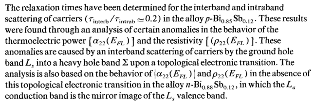 The relaxation times have been determined for the interband and intraband scattering of carriers (rinterb/rintrab ~0.2) in the alloy/7-Bi0 85 Sb012. These results were found through an analysis of certain anomalies in the behavior of the thermoelectric power [cc22(EFL) ] and the resistivity [ (p22(EFL)]. These anomalies are caused by an interband scattering of carriers by the ground hole band Ls into a heavy hole band Σ upon a topological electronic transition. The analysis is also based on the behavior of \a22{EFL) | andp22(EFL) in the absence of this topological electronic transition in the alloy n-Bi0 88 Sb012, in which the La conduction band is the mirror image of the Ls valence band.