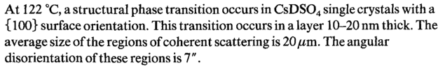 At 122 °C, a structural phase transition occurs in CsDS04 single crystals with a {100} surface orientation. This transition occurs in a layer 10-20 nm thick. The average size of the regions of coherent scattering is 20 μτη. The angular disorientation of these regions is 7".