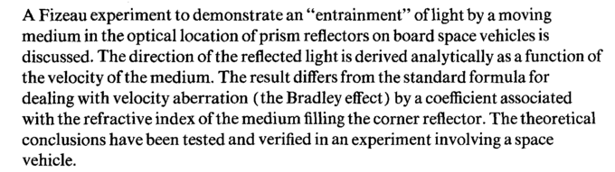 A Fizeau experiment to demonstrate an "entrainment" of light by a moving medium in the optical location of prism reflectors on board space vehicles is discussed. The direction of the reflected light is derived analytically as a function of the velocity of the medium. The result differs from the standard formula for dealing with velocity aberration (the Bradley effect) by a coefficient associated with the refractive index of the medium filling the corner reflector. The theoretical conclusions have been tested and verified in an experiment involving a space vehicle.