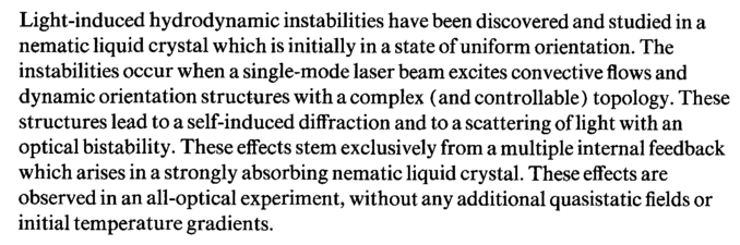 Light-induced hydrodynamic instabilities have been discovered and studied in a nematic liquid crystal which is initially in a state of uniform orientation. The instabilities occur when a single-mode laser beam excites convective flows and dynamic orientation structures with a complex (and controllable) topology. These structures lead to a self-induced diffraction and to a scattering of light with an optical bistability. These effects stem exclusively from a multiple internal feedback which arises in a strongly absorbing nematic liquid crystal. These effects are observed in an all-optical experiment, without any additional quasistatic fields or initial temperature gradients.