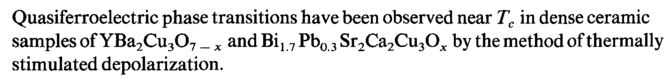 Quasiferroelectric phase transitions have been observed near Tc in dense ceramic samples of YBa2Cu307 _ x and Bij 7 Pb0 3 ÿÇ2ó&2óÝ®È by the method of thermally stimulated depolarization.
