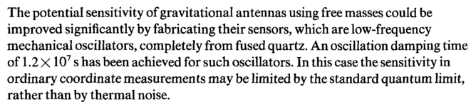 The potential sensitivity of gravitational antennas using free masses could be improved significantly by fabricating their sensors, which are low-frequency mechanical oscillators, completely from fused quartz. An oscillation damping time of 1.2 Χ107 s has been achieved for such oscillators. In this case the sensitivity in ordinary coordinate measurements may be limited by the standard quantum limit, rather than by thermal noise.