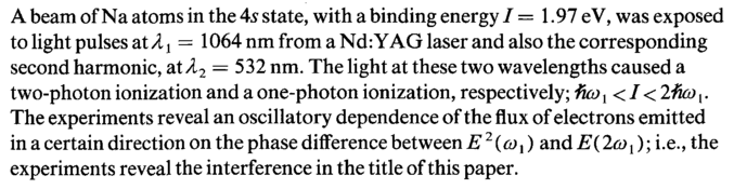 A beam of Na atoms in the 4s state, with a binding energy / = 1.97 eV, was exposed to light pulses at λ x = 1064 nm from a Nd: YAG laser and also the corresponding second harmonic, atA2 = 532 nm. The light at these two wavelengths caused a two-photon ionization and a one-photon ionization, respectively; ¥uox<I< 2ίιω,. The experiments reveal an oscillatory dependence of the flux of electrons emitted in a certain direction on the phase difference between Ε2{ωχ) and Ε(2ωί); i.e., the experiments reveal the interference in the title of this paper.