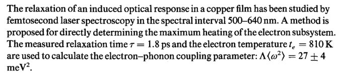 The relaxation of an induced optical response in a copper film has been studied by femtosecond laser spectroscopy in the spectral interval 500-640 nm. A method is proposed for directly determining the maximum heating of the electron subsystem, The measured relaxation time r = 1.8 ps and the electron temperature^ = 810 К are used to calculate the electron-phonon coupling parameter: Α(ω2) =27 + 4 meV2.
