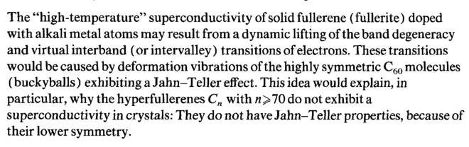 The "high-temperature" superconductivity of solid fullerene (fullerite) doped with alkali metal atoms may result from a dynamic lifting of the band degeneracy and virtual interband (or intervalley) transitions of electrons. These transitions would be caused by deformation vibrations of the highly symmetric C60 molecules (buckyballs) exhibiting a Jahn-Teller effect. This idea would explain, in particular, why the hyperfullerenes Cn with η > 70 do not exhibit a superconductivity in crystals: They do not have Jahn-Teller properties, because of their lower symmetry.