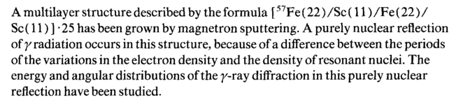 A multilayer structure described by the formula [ 57Fe (22) /Sc (11) /Fe (22) / Sc (11) ] · 25 has been grown by magnetron sputtering. A purely nuclear reflection of γ radiation occurs in this structure, because of a difference between the periods of the variations in the electron density and the density of resonant nuclei. The energy and angular distributions of the y-ray diffraction in this purely nuclear reflection have been studied.