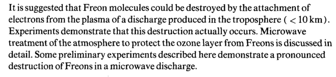 It is suggested that Freon molecules could be destroyed by the attachment of electrons from the plasma of a discharge produced in the troposphere ( < 10 km). Experiments demonstrate that this destruction actually occurs. Microwave treatment of the atmosphere to protect the ozone layer from Freons is discussed in detail. Some preliminary experiments described here demonstrate a pronounced destruction of Freons in a microwave discharge.