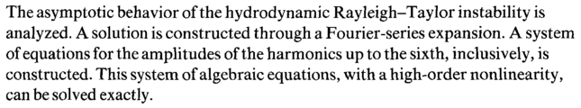 The asymptotic behavior of the hydrodynamic Rayleigh-Taylor instability is analyzed. A solution is constructed through a Fourier-series expansion. A system of equations for the amplitudes of the harmonics up to the sixth, inclusively, is constructed. This system of algebraic equations, with a high-order nonlinearity, can be solved exactly.