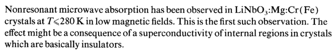 Nonresonant microwave absorption has been observed in LiNb03:Mg:Cr(Fe) crystals at Г<280 К in low magnetic fields. This is the first such observation. The effect might be a consequence of a superconductivity of internal regions in crystals which are basically insulators.
