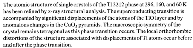 The atomic structure of single crystals of the Tl 2212 phase at 296,160, and 60 К has been refined by x-ray structural analysis. The superconducting transition is accompanied by significant displacements of the atoms of the TIO layer and by anomalous changes in the Cu05 pyramids. The macroscopic symmetry of the crystal remains tetragonal as this phase transition occurs. The local orthorhombic distortions of the structure associated with displacements of Tl atoms occur before and after the phase transition.