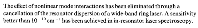 The effect of nonlinear mode interactions has been eliminated through a cancellation of the resonator dispersion of a wide-band ring laser. A sensitivity better than 10"10 cm~1 has been achieved in in-resonator laser spectroscopy.