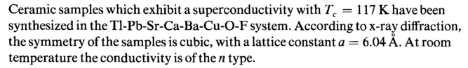 Ceramic samples which exhibit a superconductivity with Tc = 117 К have been synthesized in the Tl-Pb-Sr-Ca-Ba-Cu-O-F system. According to x-ray diffraction, the symmetry of the samples is cubic, with a lattice constant a = 6.04 A. At room temperature the conductivity is of the η type.