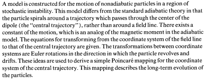 A model is constructed for the motion of nonadiabatic particles in a region of stochastic instability. This model differs from the standard adiabatic theory in that the particle spirals around a trajectory which passes through the center of the dipole (the "central trajectory"), rather than around a field line. There exists a constant of the motion, which is an analog of the magnetic moment in the adiabatic model. The equations for transforming from the coordinate system of the field line to that of the central trajectory are given. The transformations between coordinate systems are Euler rotations in the direction in which the particle revolves and drifts. These ideas are used to derive a simple Poincare mapping for the coordinate system of the central trajectory. This mapping describes the long-term evolution of the particles.