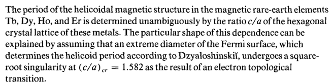 The period of the helicoidal magnetic structure in the magnetic rare-earth elements Tb, Dy, Ho, and Er is determined unambiguously by the ratio с/a of the hexagonal crystal lattice of these metals. The particular shape of this dependence can be explained by assuming that an extreme diameter of the Fermi surface, which determines the helicoid period according to Dzyaloshinskii, undergoes a square-root singularity at (c/a)cr = 1.582 as the result of an electron topological transition.
