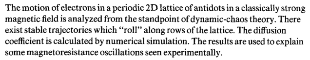 The motion of electrons in a periodic 2D lattice of antidots in a classically strong magnetic field is analyzed from the standpoint of dynamic-chaos theory. There exist stable trajectories which "roll" along rows of the lattice. The diffusion coefficient is calculated by numerical simulation. The results are used to explain some magnetoresistance oscillations seen experimentally.