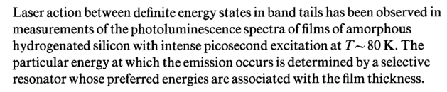 Laser action between definite energy states in band tails has been observed in measurements of the photoluminescence spectra of films of amorphous hydrogenated silicon with intense picosecond excitation at T~ 80 K. The particular energy at which the emission occurs is determined by a selective resonator whose preferred energies are associated with the film thickness.
