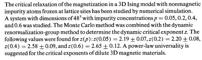 The critical relaxation of the magnetization in a 3D Ising model with nonmagnetic impurity atoms frozen at lattice sites has been studied by numerical simulation. A system with dimensions of483 with impurity concentrations ρ = 0.05,0.2,0.4, and 0.6 was studied. The Monte Carlo method was combined with the dynamic renormalization-group method to determine the dynamic critical exponent z. The following values were found forz(/?):z(0.05) = 2.19 + 0.07,z(0.2) 2.20 + 0.08, z(0.4) = 2.58 ± 0.09,andz(0.6) = 2.65 + 0.12. A power-law universality is suggested for the critical exponents of dilute 3D magnetic materials.