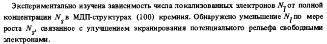 Экспериментально изучена зависимость числа локализованных электронов Nj от полной концентрации Ng в МДП-структурах (100) кремния. Обнаружено уменьшение N^ по мере роста N. связанное с улучшением экранирования потенциального рельефа свободными s электронами.