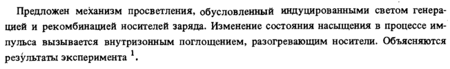 Предложен механизм просветления, обусловленный индуцированными светом генерацией и рекомбинацией носителей заряда. Изменение состояния насыщения в процессе импульса вызывается внутризонным поглощением, разогревающим носители. Объясняются / ι результаты эксперимента .